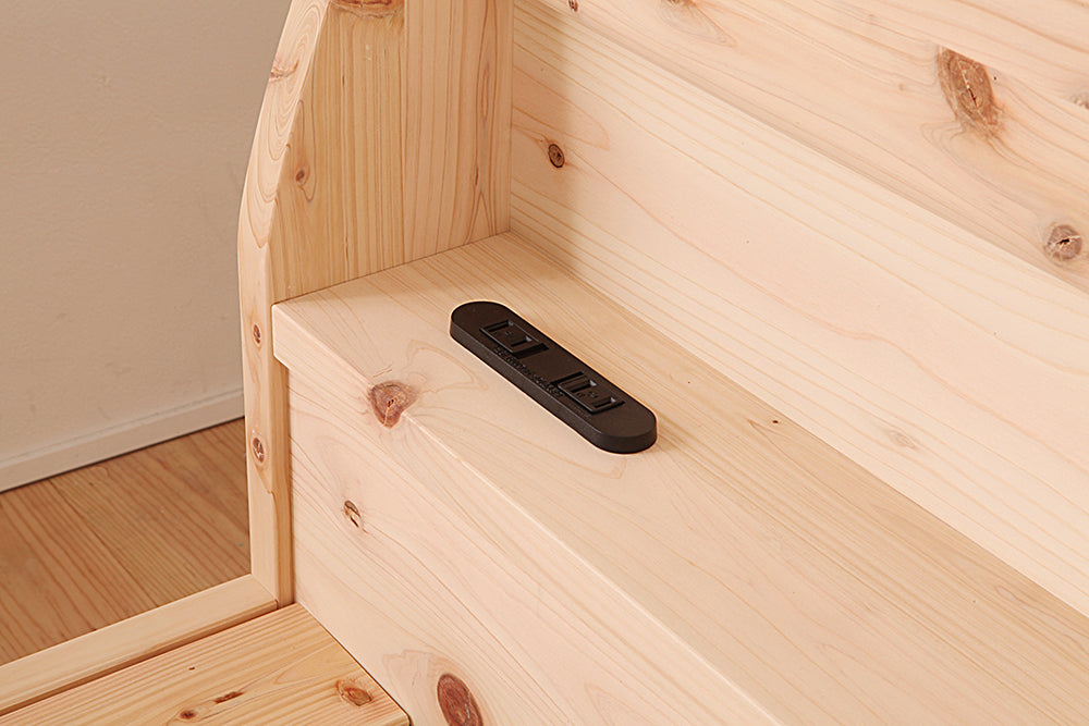 機能面も充実。ヘッド部分には奥行10cmの棚とコンセントを備え、スマートフォンなどの充電も可能。フレームはJIS規格の試験に合格しており、安心して長くお使いいただけます。高さは4段階に調整でき、床下を収納に活かしたり、掃除のしやすさを工夫したりと、暮らしに合わせてアレンジできます。