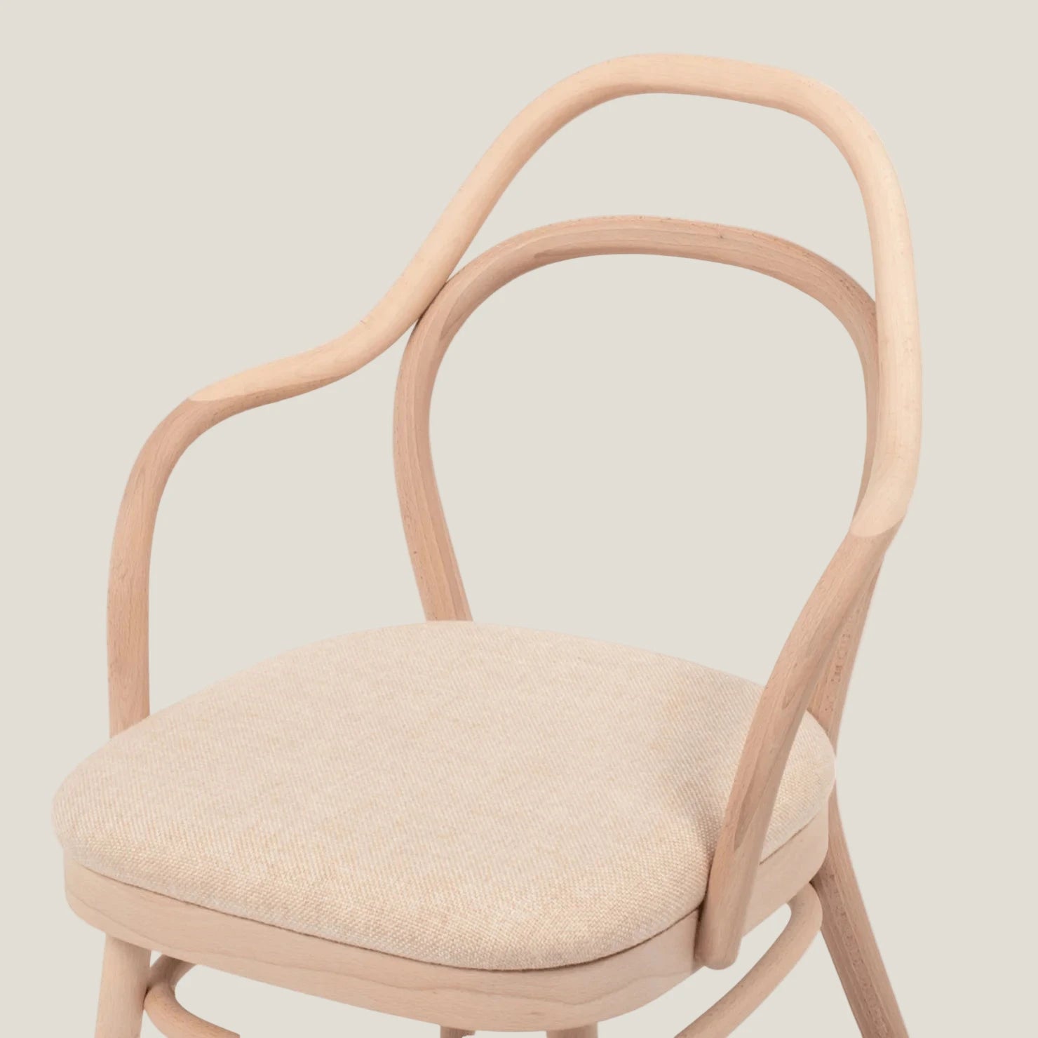 木を丁寧に曲げて形づくられた柔らかなラインは、背から肘へと自然につながり、身体をやさしく支えてくれます。