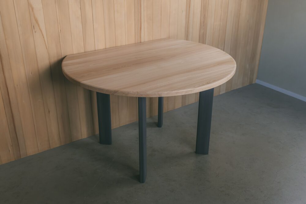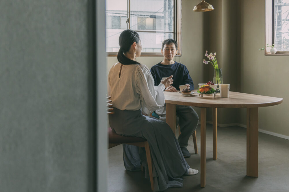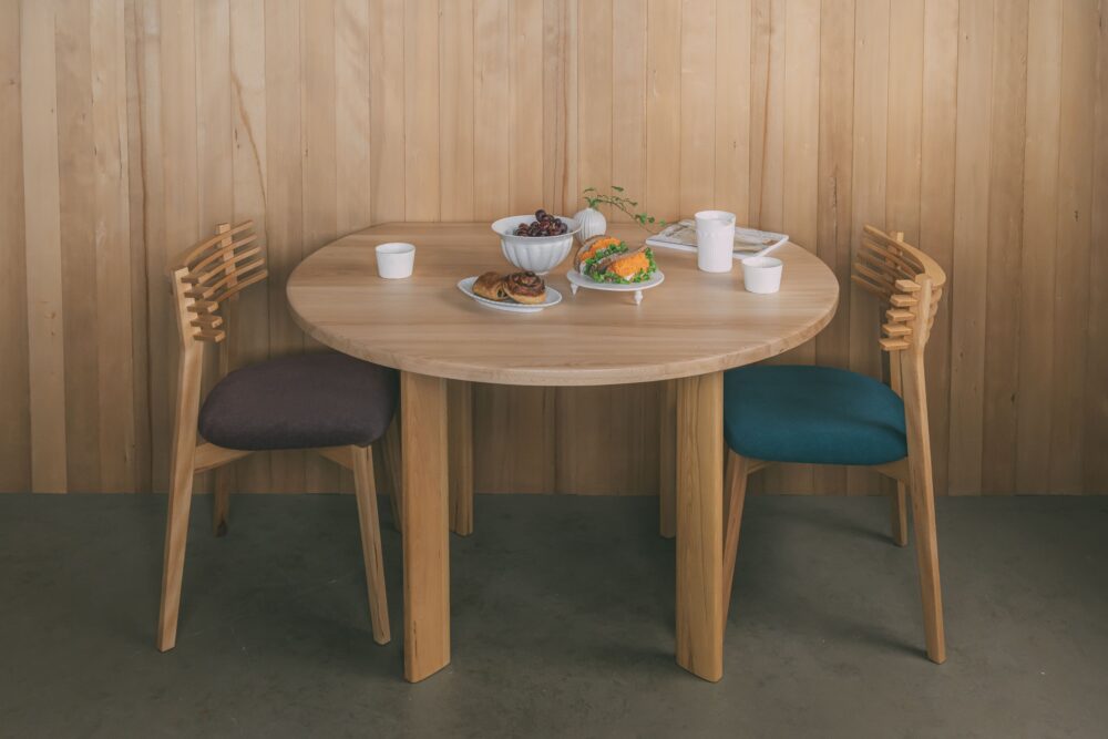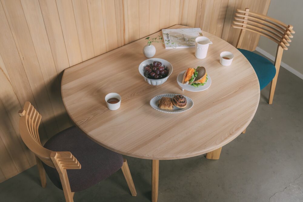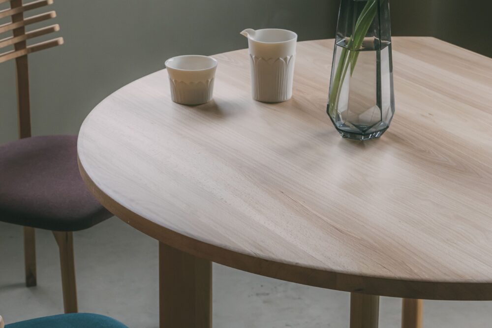 丸テーブルの利点である優しい雰囲気を保ちながら、脚部の配置にも工夫が凝らされています。