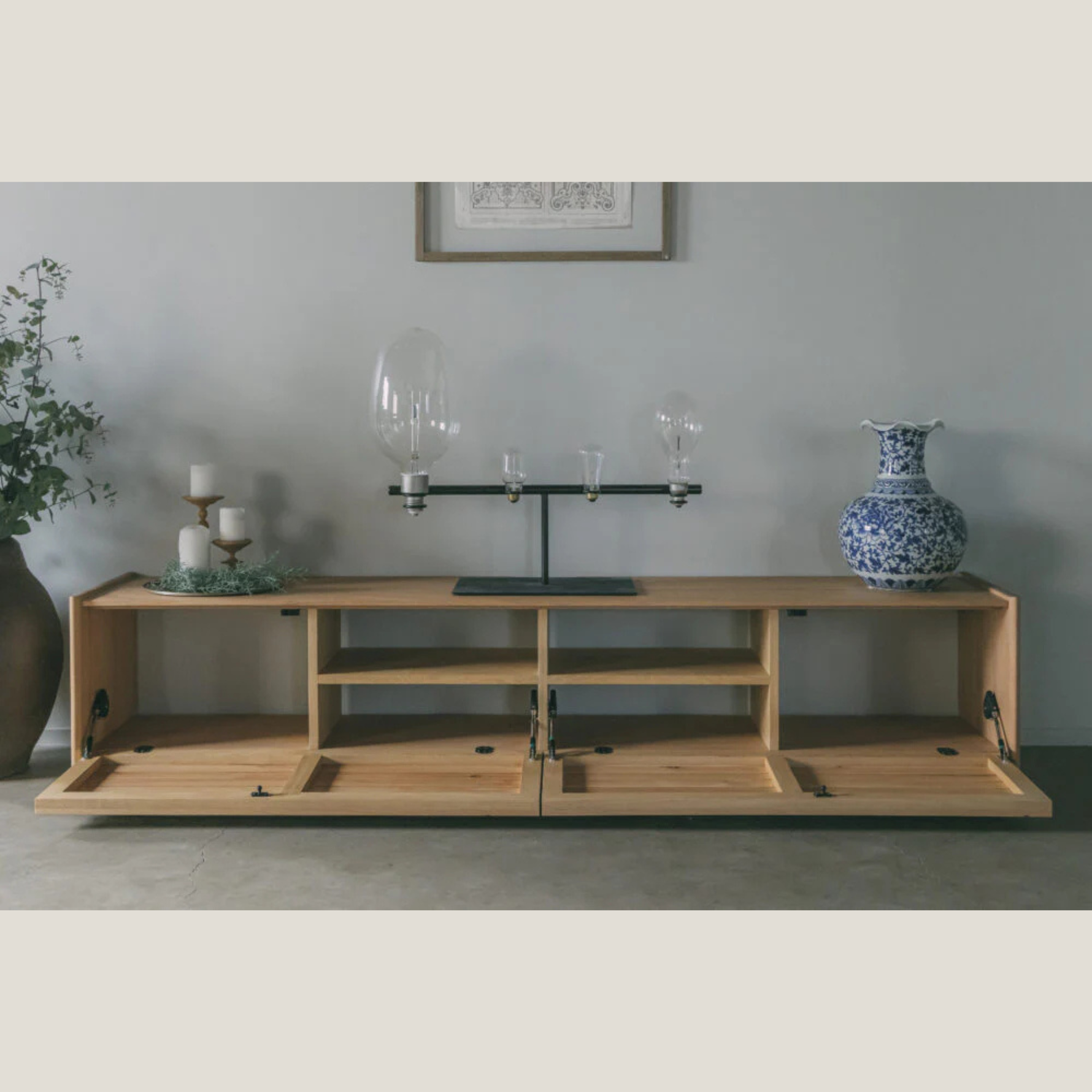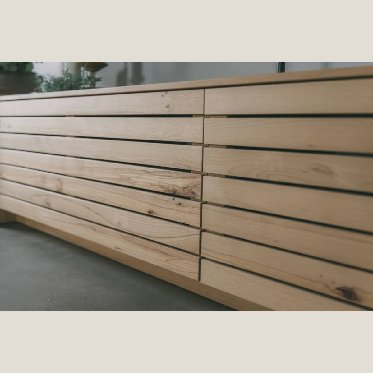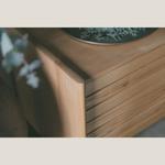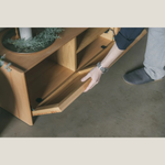 本体がシャープで滑らかなデザインである一方、扉には節や偽心材(腐朽菌によって変異した材)のような風合いのある部位を使用し、ナチュラルやモダンなどあらゆるコーディネートに馴染みます。