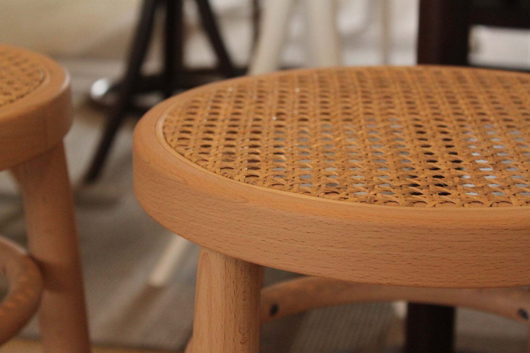 北欧スタイルや明るいインテリアにも相性のよい、籐張りの座面が他にはない個性的なスツール。