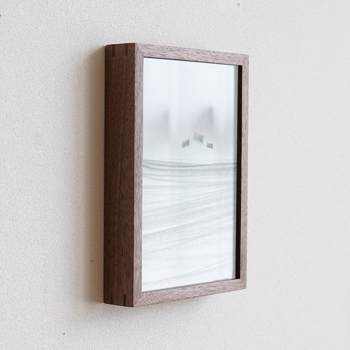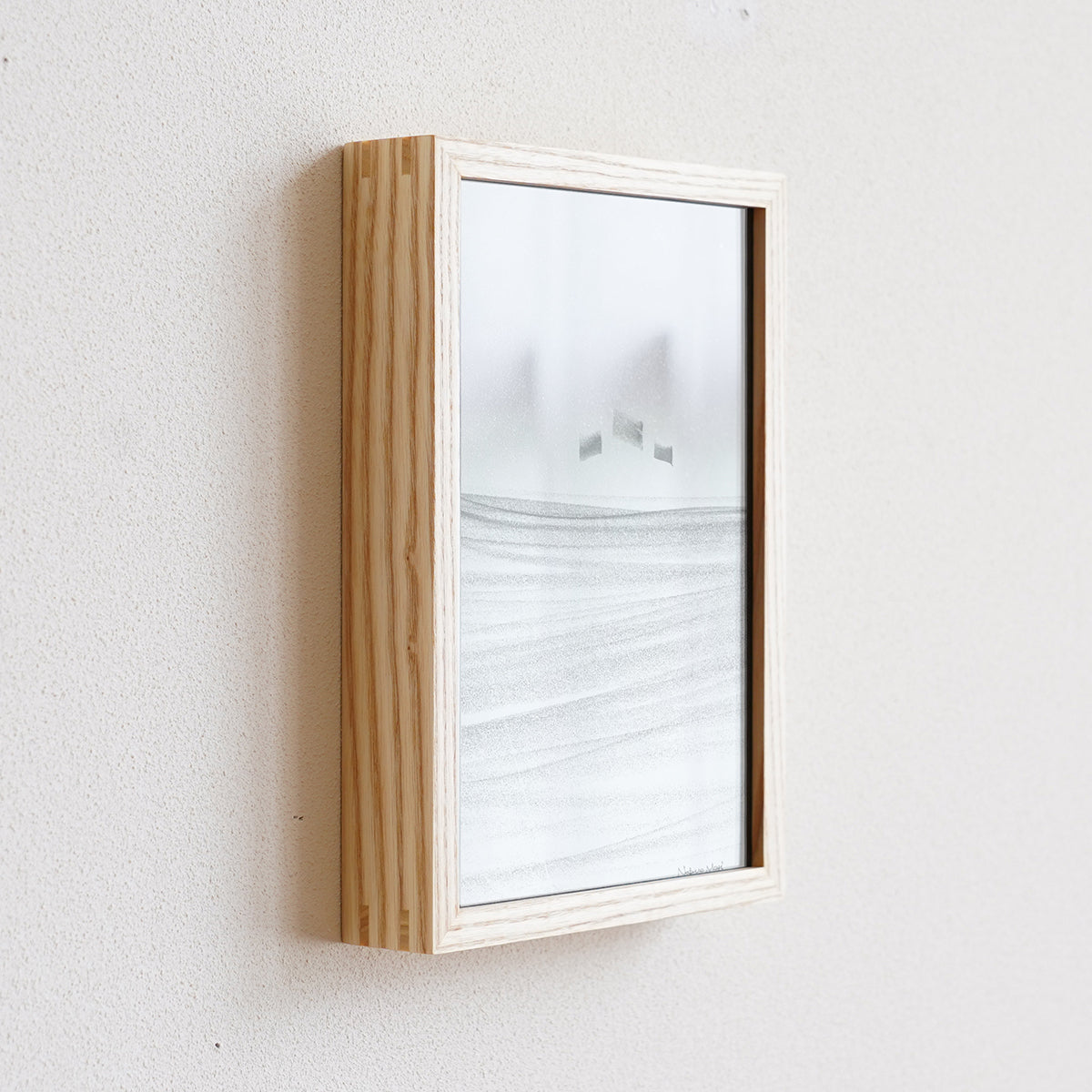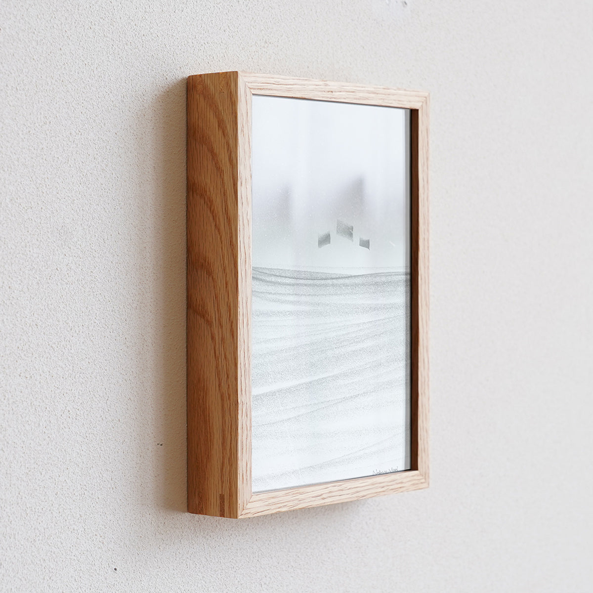 We have focused deeply on the essential role of a frame: ensuring the artwork stays in close contact with the acrylic plate. By using wooden fasteners that fit into internal grooves along with an integrated urethane sheet, the frame holds the artwork and backboard firmly in place, allowing pieces of standard thickness to sit beautifully against the surface.