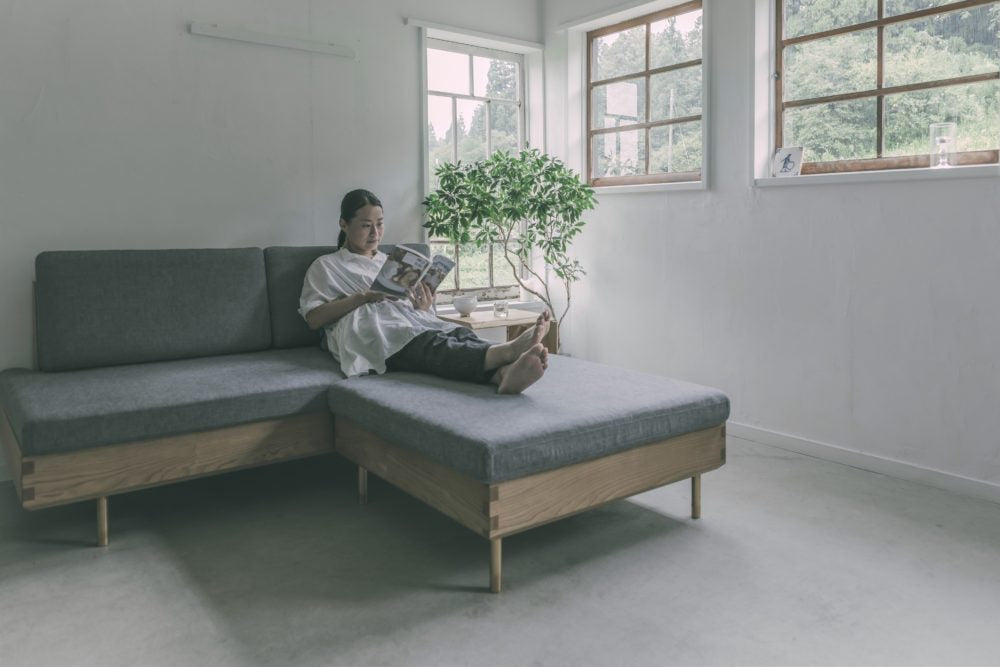 本体フレームには、温かみのある北東北の栗の無垢材を使用し、木の風合いを最大限に生かすオイルフィニッシュで仕上げられています。フレームの接合部には、木材を凸凹に加工し組み上げる伝統的なロッキング工法を採用。これは無垢材の自然な収縮に対応できる堅牢な構造であるとともに、デザイン上のアクセントにもなっています。