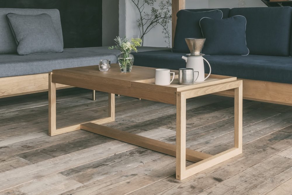 クリ材が持つ自然な表情とテーブルの静かで美しい佇まいが、ソファ周りだけでなく床座の空間にも心地よく馴染み、和洋を問わず幅広いインテリアに調和します。