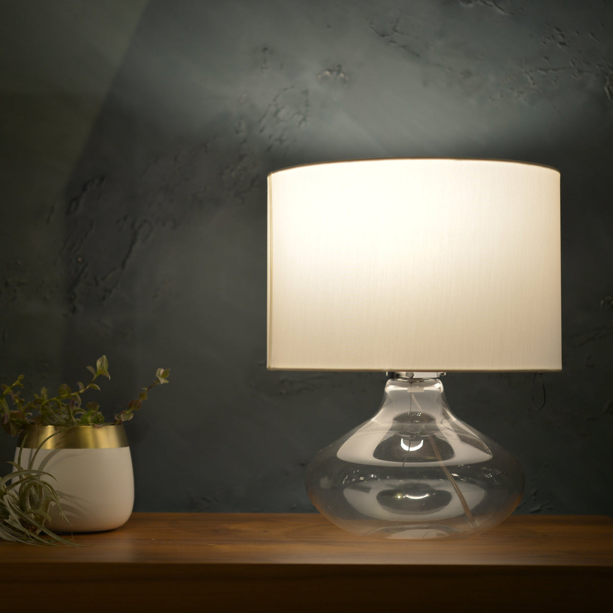美しいガラスベースに、シンプルなファブリックシェードを合わせたDI CLASSEの作り出す、ベーシックなデザインです。