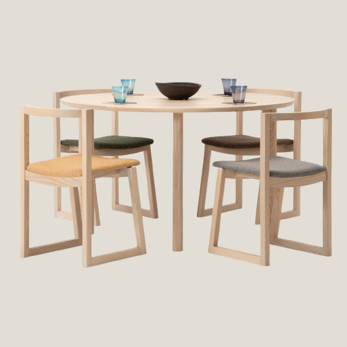 座る人数を限定せず、互いの視線が広がり場が和やかになる丸いテーブルは、角がないので空間も穏やかになります。