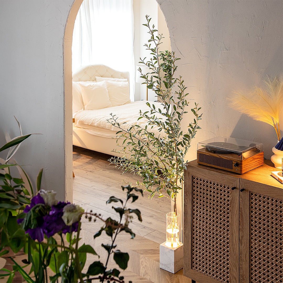枝ものや水耕栽培できる観葉植物を付属の花瓶に入れ、下からLEDでライトアップ。