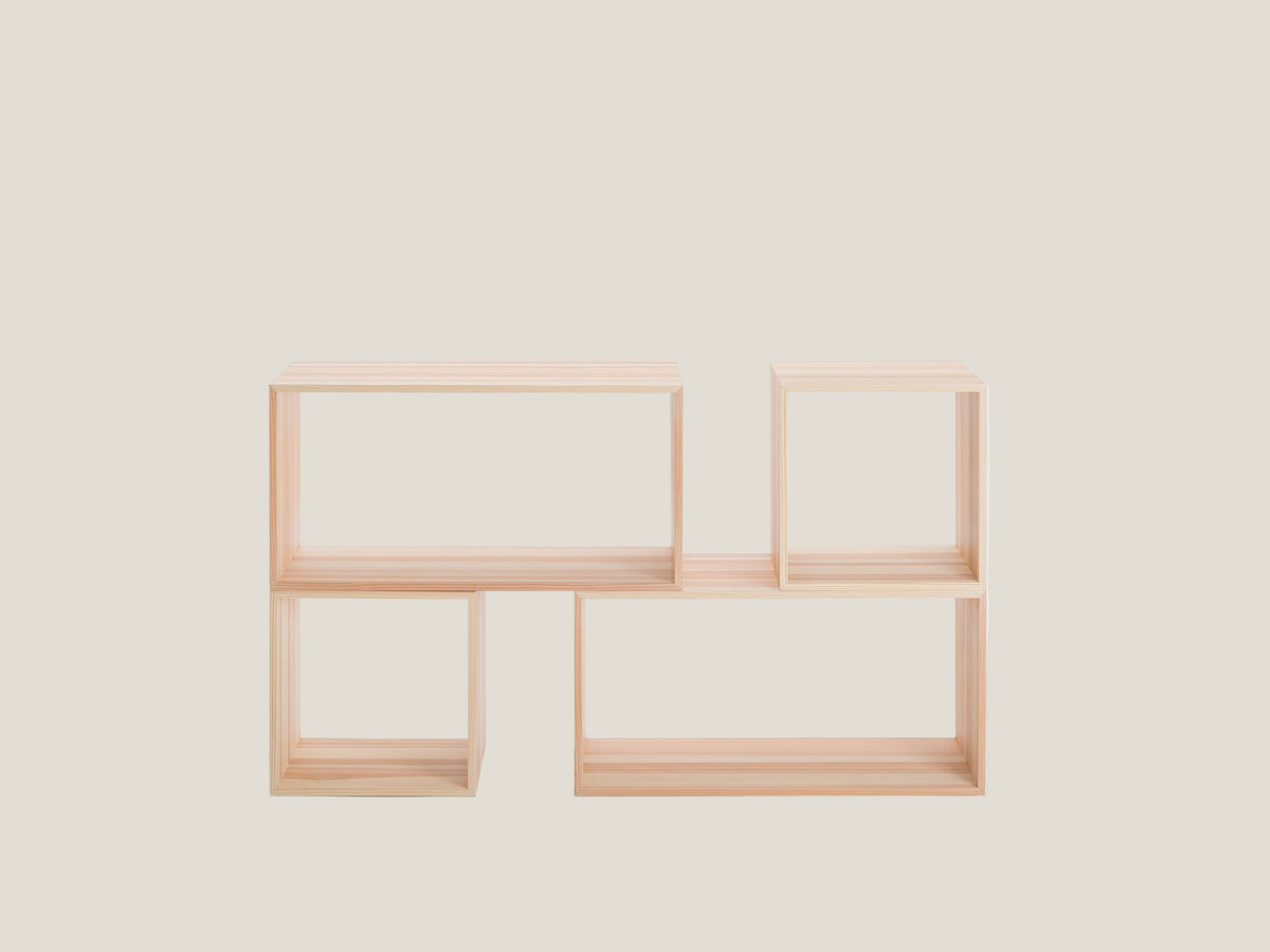 スギの赤板と白板をストライプ状に組み合わせて成形したこれ以上ないぐらいシンプルに構成したボックス。