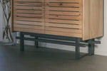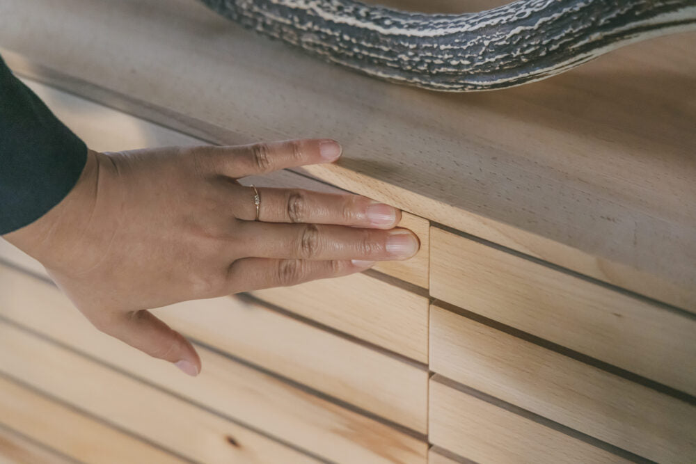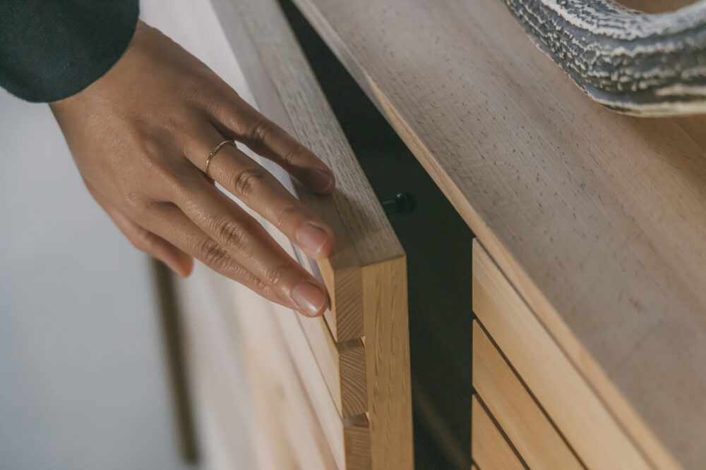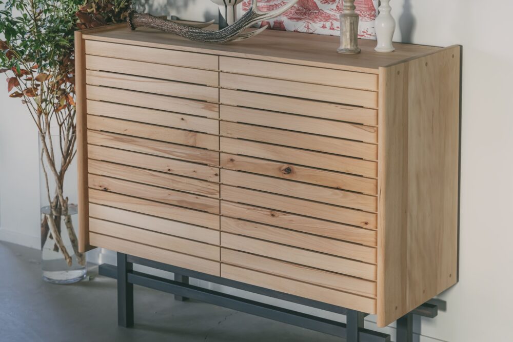 本体がシャープで滑らかなデザインである一方、扉には節や偽心材(腐朽菌によって変異した材)のような風合いのある部位を使用し、ナチュラルやモダンなどあらゆるコーディネートに馴染みます。